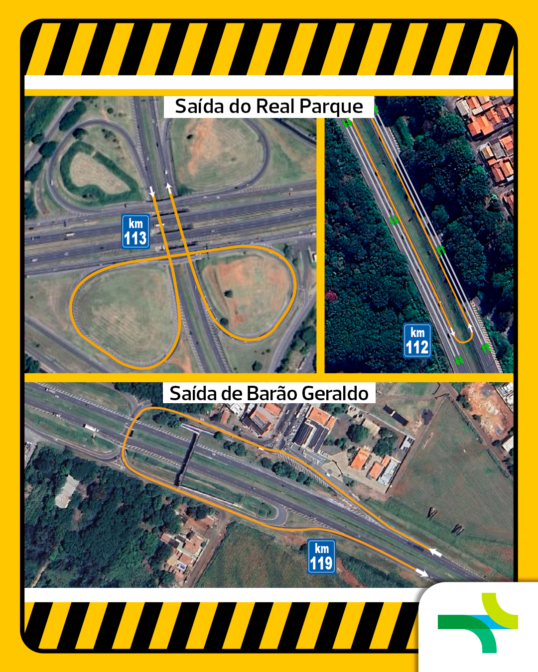 Saída do Real Parque - Quem irá seguir para Barão Geraldo deverá pegar a pista sentido Campinas da Prof. Zeferino Vaz. Para minimizar os impactos no trânsito, haverá duas opções de retorno: no km 113, entroncamento com a D. Pedro I, que deverá ser utilizado prioritariamente por ônibus e caminhões; e um dispositivo temporário construído no km 112 do Tapetão, exclusivo para carros e motocicletas.